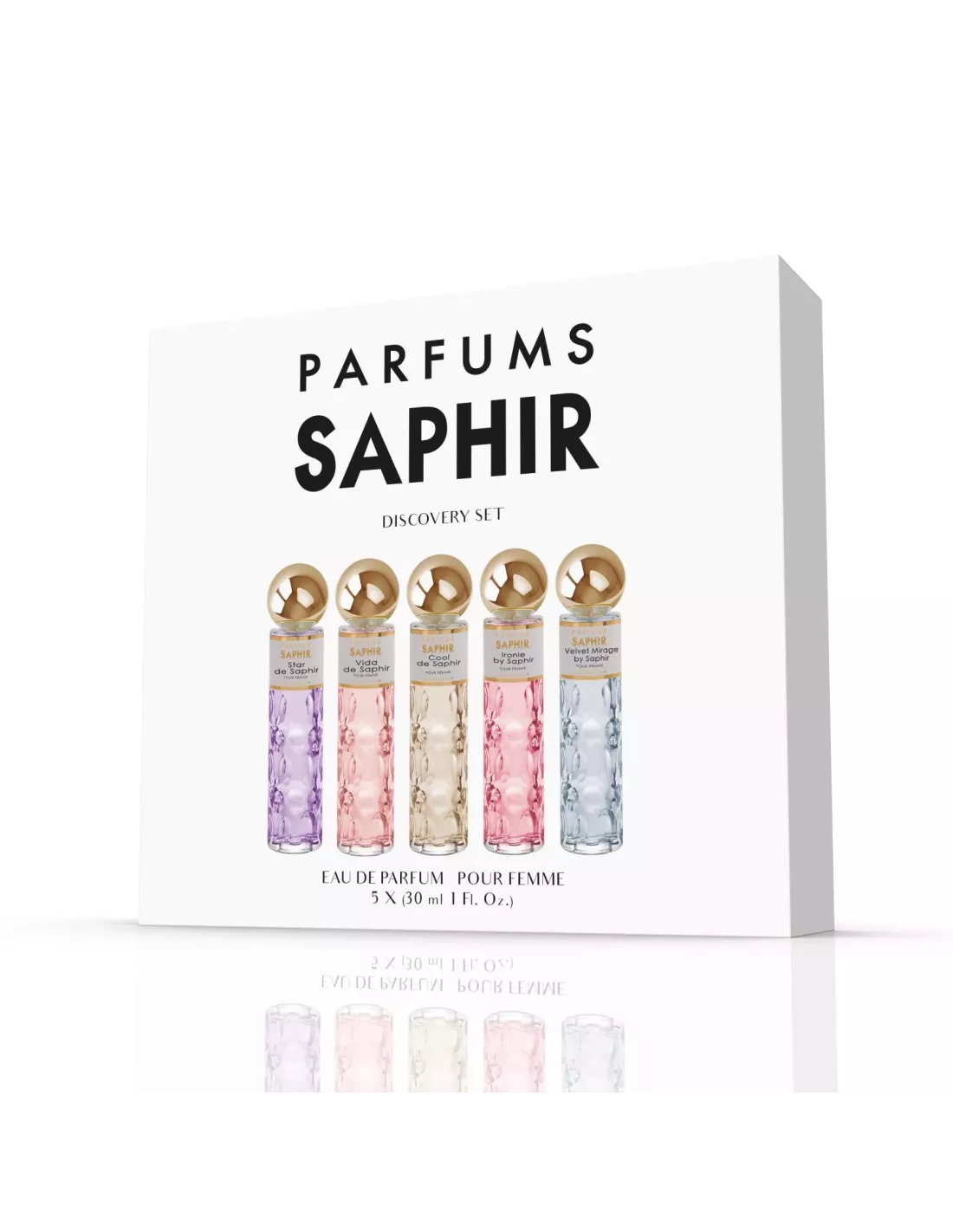 W eleganckim komplecie znajdziesz pięć kompozycji: Star de Saphir, Vida de Saphir, Cool by Saphir, Ironie by Saphir i Velvet Mirage by Saphir, które pozwolą Ci odkryć pełne spektrum kobiecych aromatów – od świeżych i energetyzujących po ciepłe i zmysłowe.